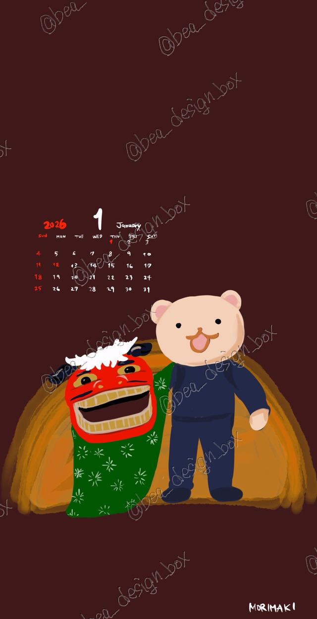 獅子舞を脱いだベアのカレンダーです。 2026年1月 ベアファンのために描いた1枚です。 普段は300円でSUZURIで置いていたベアカレンダーですが今回BASEにて販売いたします。 新春特価222円! 発送はギガファイル便にてデータで送らせていただきます。